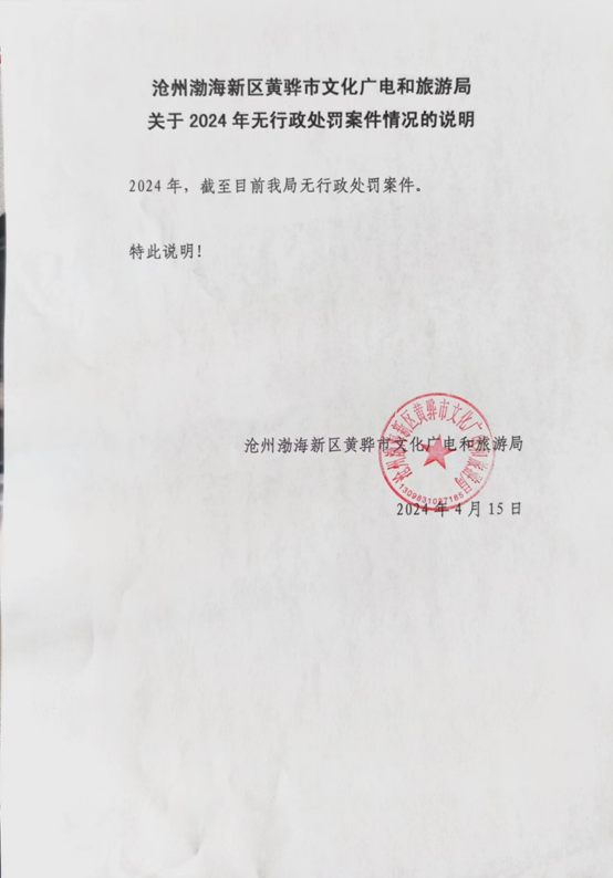 滄州渤海新區(qū)黃驊市文化廣電和旅游局無行政處罰情況說明
