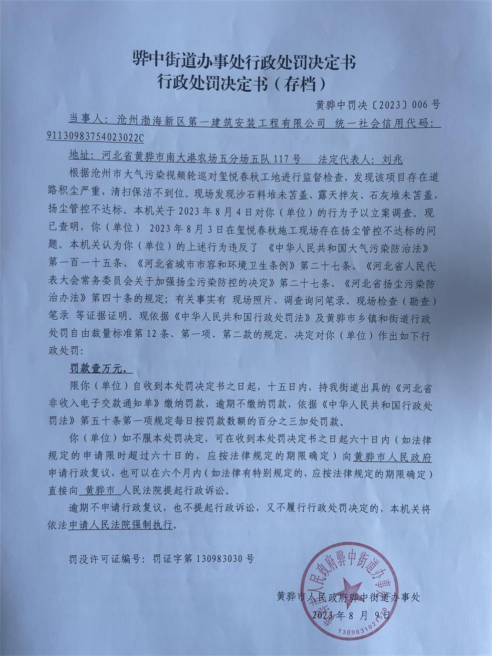 關于對滄州渤海新區(qū)第一建筑安裝工程有限公司的行政處罰